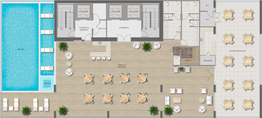 3 niveles con espacios que buscan generar comunidad, donde cada amenidad pone el factor humano en el centro del pensamiento, diseñando un ecosistema integral: SEASIDE URBAN CLUB, que se adapta a las necesidades de los huéspedes, se integra al entorno vibrante de Calle Uruguay y se perfila como área que fomenta creatividad, conexión e inspiración.